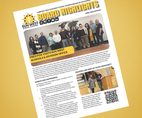 The Sun West School Division acknowledges that we are on Treaty 6 and Treaty 4 territories. This land that we share has long been home to the Cree, Saulteaux, Nakoda, Lakota, Dakota Peoples and the Metis.