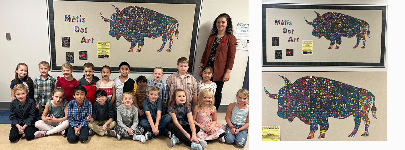 Tanisha Gunnlaugson’s Grade 2 class at Westberry Elementary School in Kindersley recently completed an exciting Métis Dot Art project. The Sun West Indigenous Consultant Brie Phillips visited the classroom and taught the students how to the techniques of Métis Dot Art. The students used this knowledge to create a bison art project puzzle. Each student was given a piece of a puzzle that together would make a bison. The students then decorated their puzzle pieces with Métis Dot Art and when everyone had completed their work, they constructed the puzzle and displayed it on a large bulletin board near their classroom.