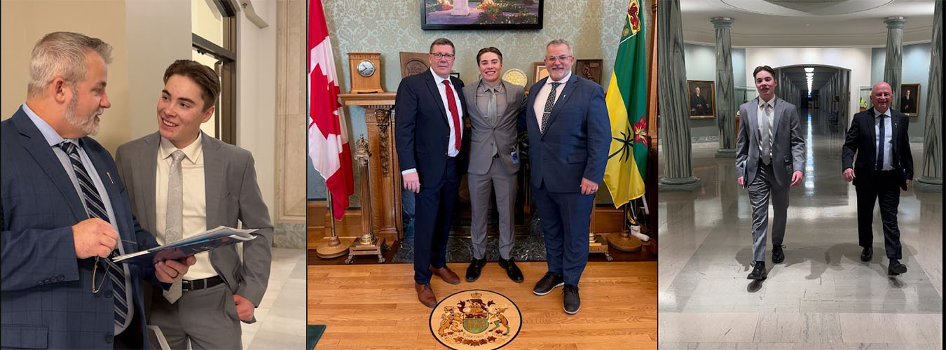 The work placement turned out to be even bigger than Vincent requested. He was set up with three local MLAs: Barret Kropf, MLA for Dakota-Arm River, who represents the area around Loreburn as well as Davidson and Outlook, Kim Gartner, MLA for Kindersley-Biggar and currently Minister of Highways, and Jim Reiter, MLA for Rosetown-Delisle, and currently Minister of Finance. Vincent had the opportunity to work in the offices both in the Legislative Building in Regina, their local MLA offices in Davidson, Rosetown, and Kindersley as well as travel with them to several events in their constituencies.